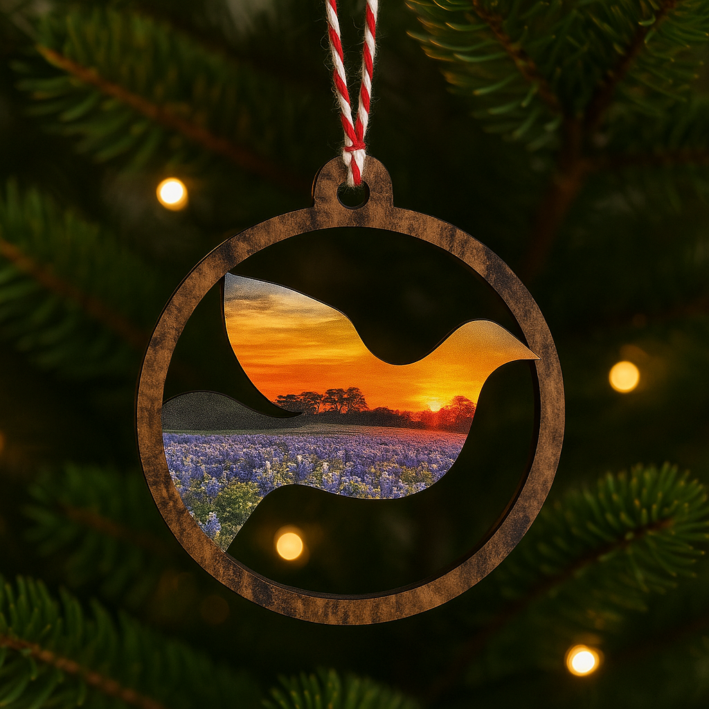 The dove has carried meanings of peace, renewal, and hope across countless generations. In this StoryTidings ornament, its graceful flight is illuminated by a Texas sunset, glowing orange and gold against the horizon. Below, a meadow of bluebonnets sways gently in the fading light—an image of calm and belonging that feels as eternal as the land itself.
