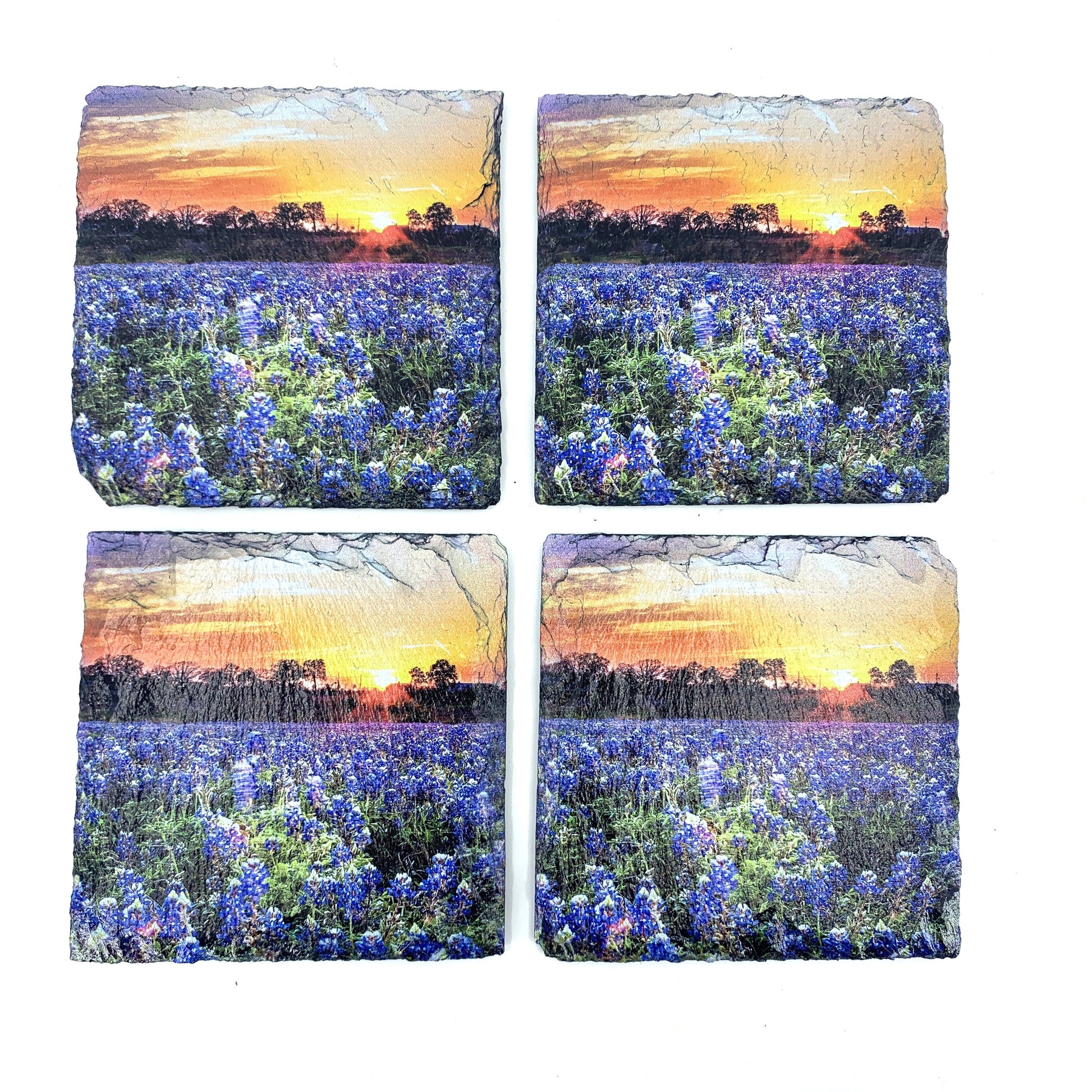 There’s something magical about a Texas sunset casting golden light across a field of bluebonnets. This set of natural slate coasters captures that fleeting beauty—transformed into timeless, rustic decor. Whether you’re sipping sweet tea on the porch or hosting friends indoors, these Texas wildflower coasters add warmth, charm, and protection to any space.