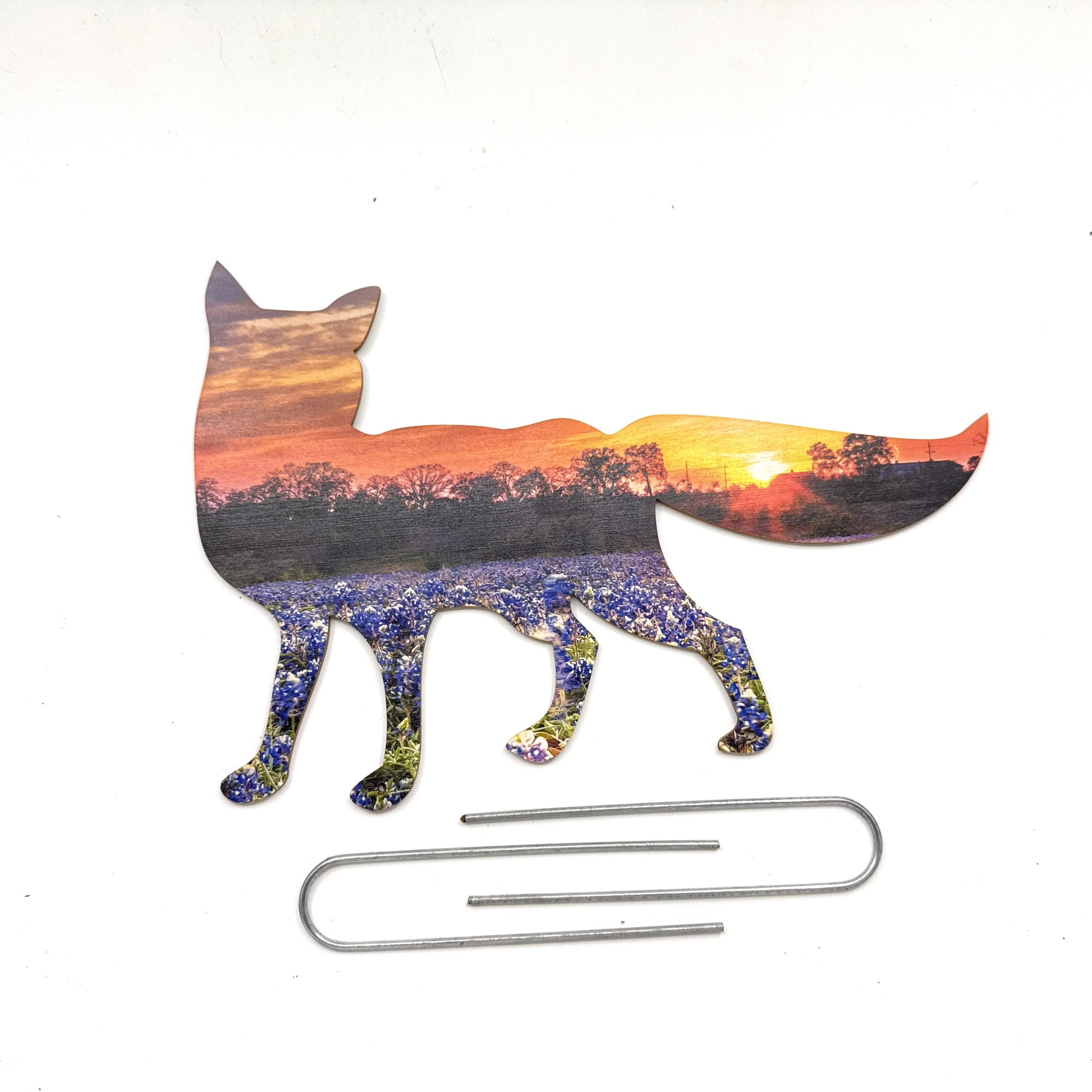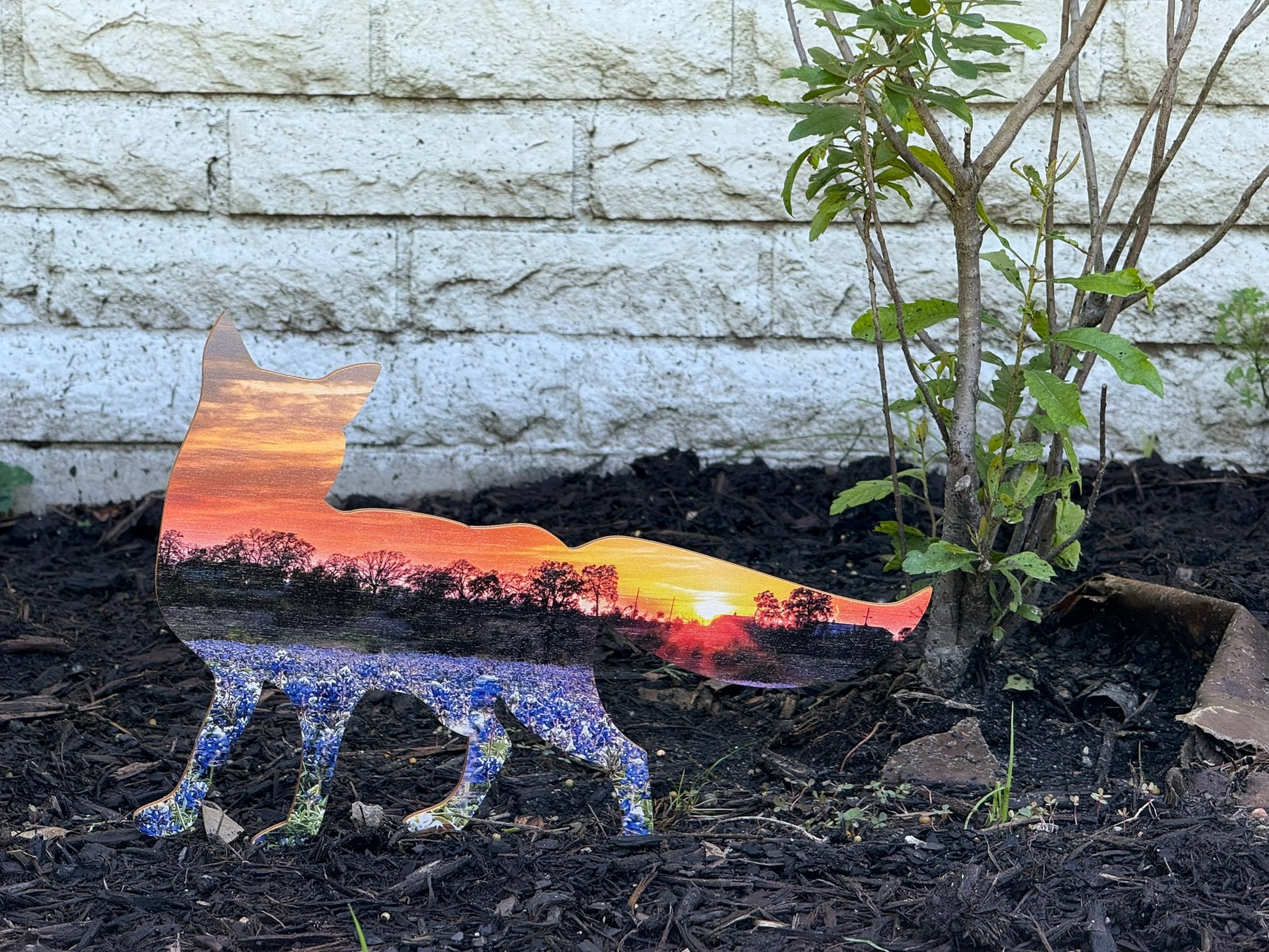 Let your garden come alive with Rowan the Fox, a vibrant and clever companion from our growing collection of StoryGarden Critters. Inspired by the iconic StoryPiece silhouette from our puzzle A Bluebonnet Sunset, this fox is a curious cutout—laser-cut from wood and brought to life with the colors of a Texas spring and a glowing sunset sky.