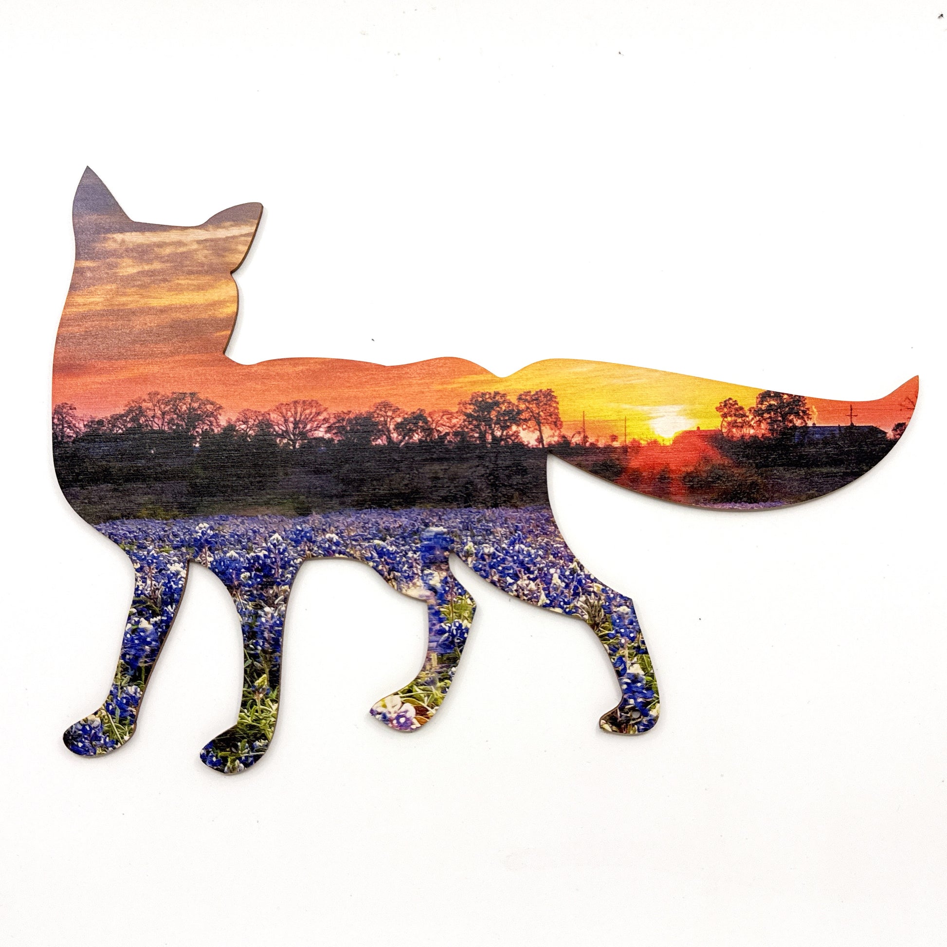 Crafted from durable 1/8” wood and sealed for outdoor display, Rowan is UV-printed with artwork pulled directly from our handcrafted wooden jigsaw puzzle. The effect is magical: a fox outlined in bold twilight hues, filled with blooming bluebonnets and the warmth of a southern evening.