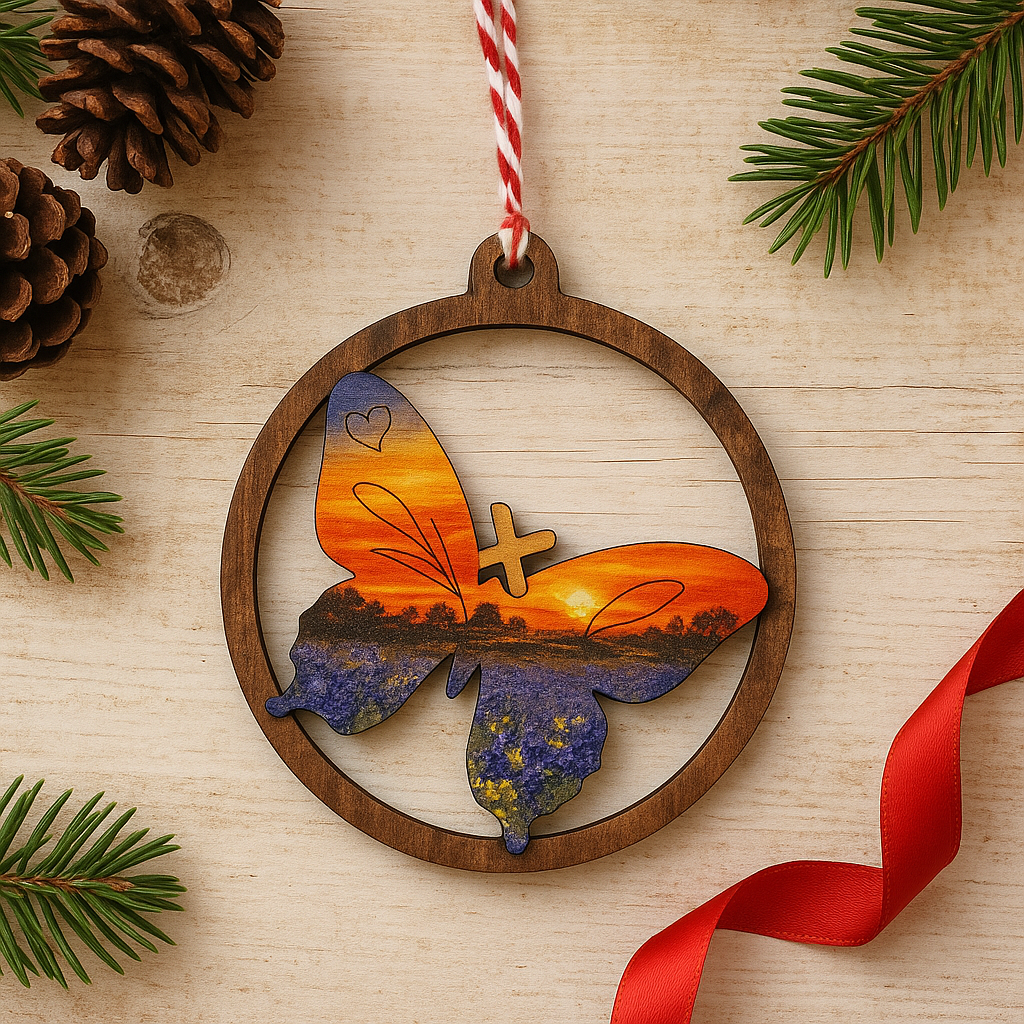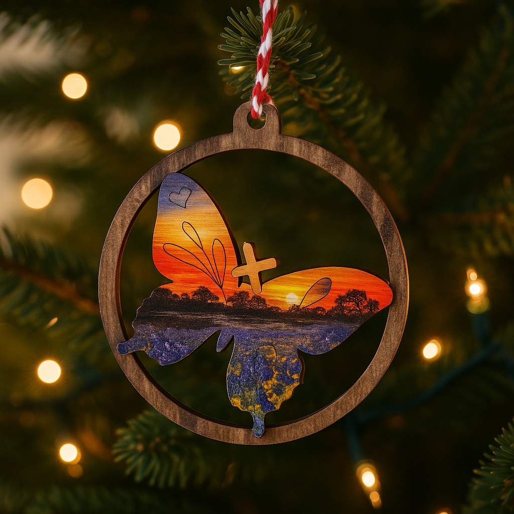 The Butterfly Sunset StoryTidings Ornament captures the wonder of transformation and the serenity of a Texas sunset. A butterfly, symbol of renewal and hope, spreads its wings across fields of bluebonnets and glowing skies, framed within a rustic wooden circle. This ornament blends the magic of nature with the warmth of handcrafted artistry, making it a meaningful keepsake for your holiday traditions.